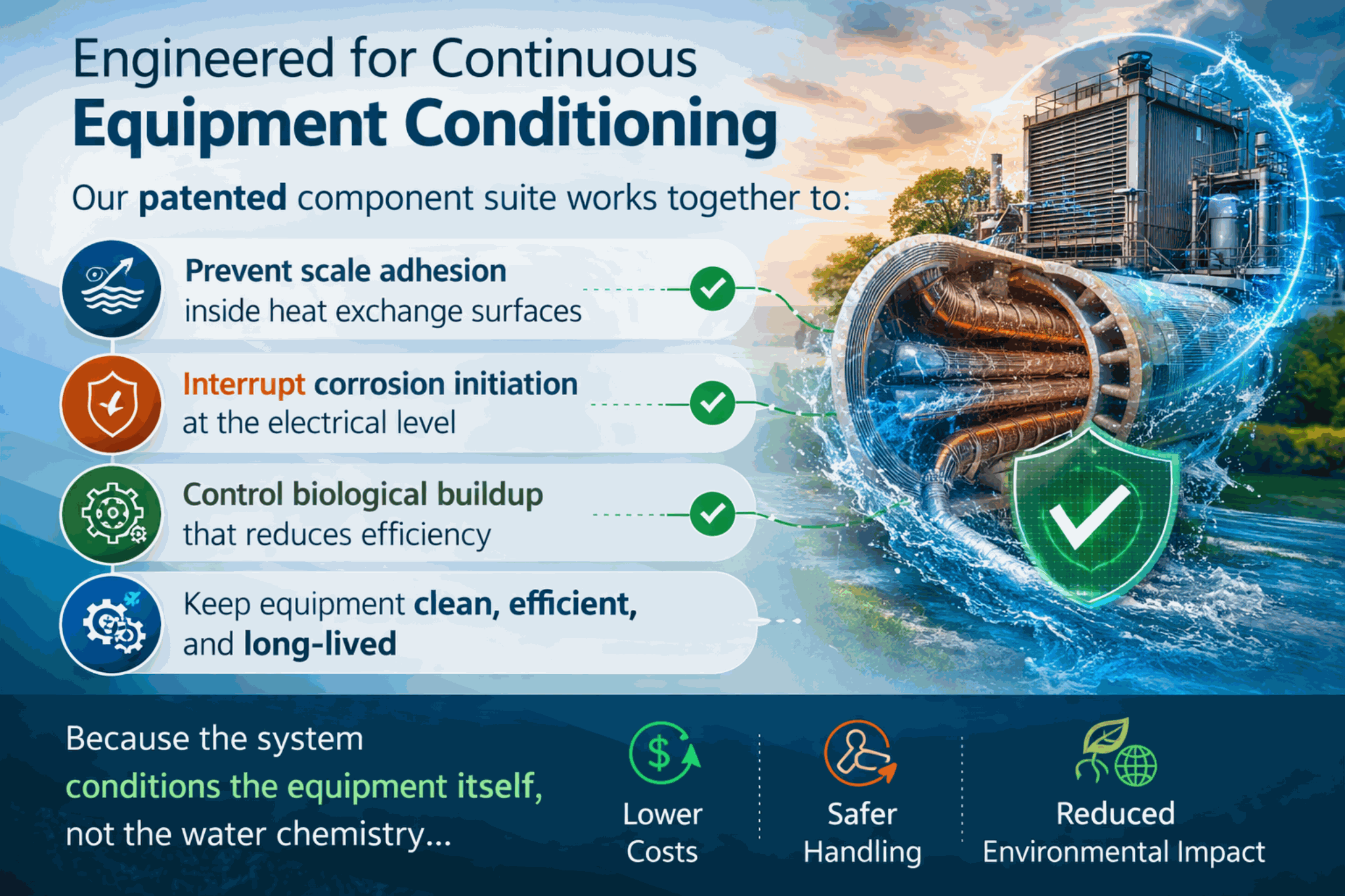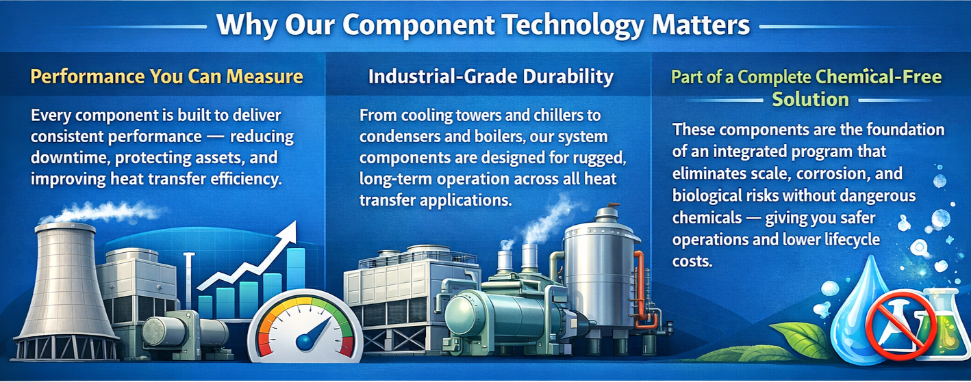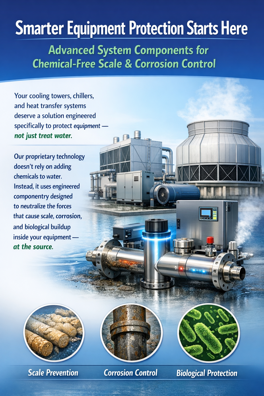 Instead, it uses engineered componentry designed to neutralize the forces that cause scale, corrosion, and biological buildup inside your equipment — at the source.